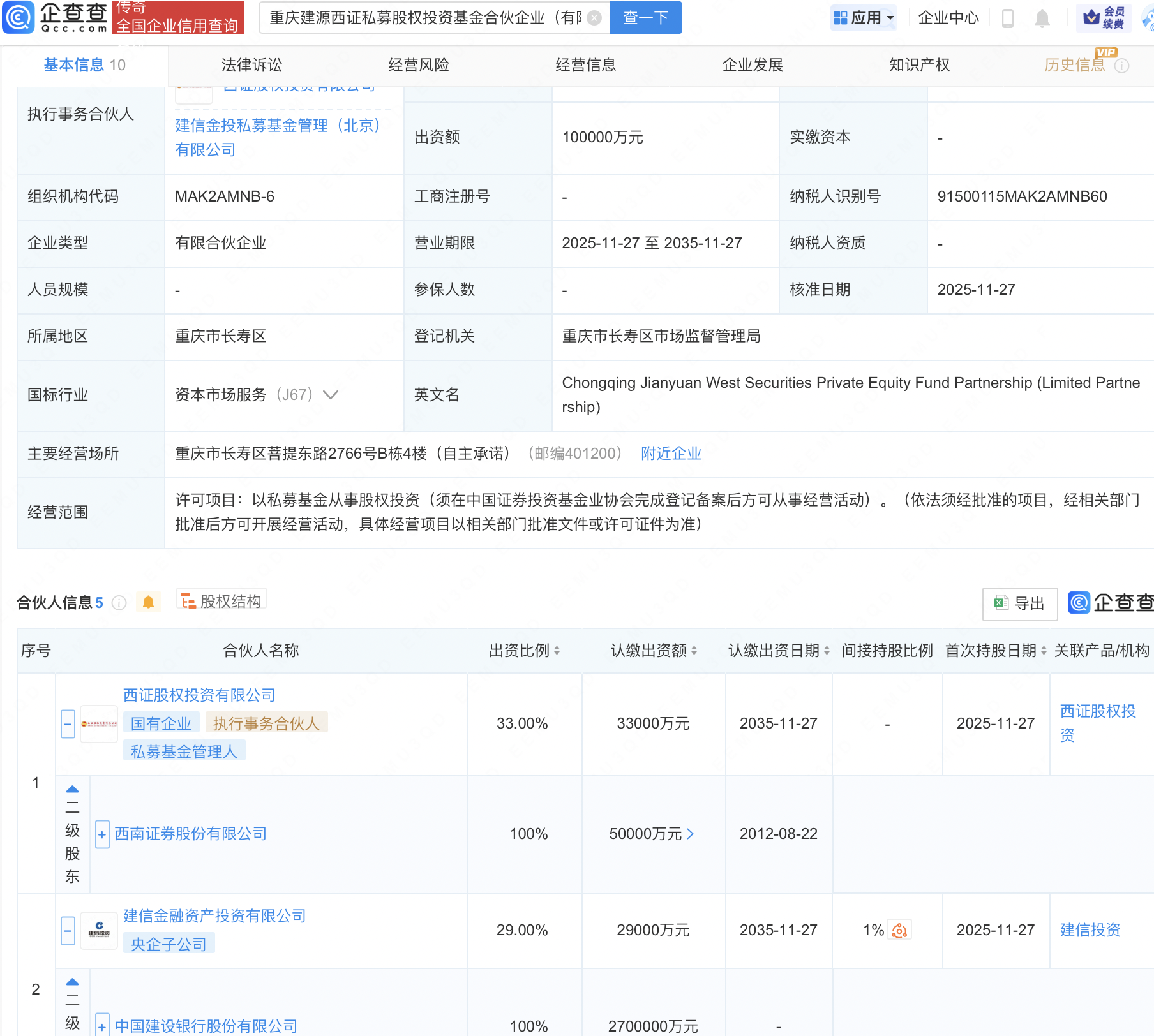 近日股票优配平台,重庆建源西证私募股权投资基金合伙企业(有限合伙)成立,出资额10亿元,经营范围包含以私募基金从事股权投资。企查查股权穿透显示,该企业由西南证券(600369)全资子公司西证股权投资有限公司、建设银行(601939)全资子公司建信金融资产投资有限公司等共同出资。